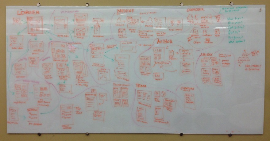One the most useful techniques of Team of One that I adopted was the use of the sketchboard. You hang and enormous sheet of butcher paper on a wall — preferably in a well exposed, high traffic area — and post sketches of whatever project you’re currently working on. You include requirements, notes, and any other necessary information along with a kit of makers and sticky notes to allow others to contribute. I grew this technique out to include research boards for curating information about our users.
